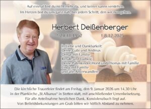 Am Montag, dem 8.12.2025, verstarb nach kurzer, schwerer Krankheit unser Schachfreund Herbert Deißenberger von der Schachabteilung der SpVgg Stetten im Alter von 73 Jahren.